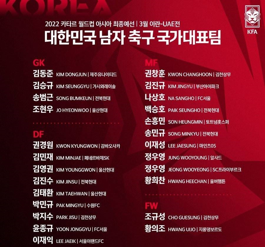 北京时间2022年3月14日,韩国足协公布了世预赛大名单,其中,热刺前锋孙兴O领衔,波尔多球员黄义助入选。目前,韩国队已经提前晋级世界杯,世预赛最后两个对手分别为伊朗和阿联酋。